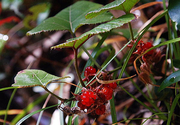 | これから冬に向かいますがこの時期に山を歩く時に目にしてとてもうれしいもの、それがこのフユイチゴです。草本ではヘビイチゴのように食べられないものがありますが、木本のイチゴはどれも食べられるということです。初夏から真夏に山へ行けばニガイチゴ、クマイチゴ、ナガバモミジイチゴ・・・などの木本のイチゴが熟しています。どれも食べたらおいしい。しかし冬は木本のイチゴは目につかない。ただ小さなつる状のイチゴのフユイチゴの実が赤くなっている。食べたらとてもおいしい。ふぃゆイチゴは冬に山を歩く時の大おごちそうだ。このフユイチゴ小さなつる状の草本のように見えるが木本のイチゴなのですね。クリックすると「フユイチゴのページ」へ |