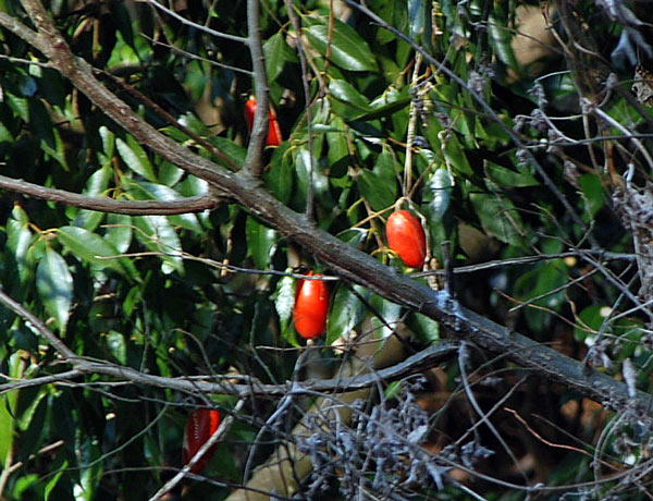 | カラスウリ(ウリ科) お正月の三が日が過ぎた。「今年の初歩きだ」と近くの野山を歩いていた。目にはいる花はない。まさに冬の光景の中を冷たい風に吹かれながら歩いていると、突然、鮮やかな色のものが目に飛び込んできた。よく見るとカラスウリの実がまだまだ美しく輝いていた。カラスウリの別名はタマズサという。種の形が結び文の形をしている。この種は打ち出の小槌の形にも見える。今年の初歩きのときにいいものが目に入ってうれしい。クリックすると「カラスウリのページ」へ |