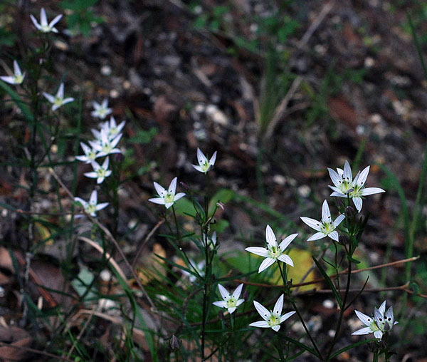 | 明るいハイキング道を歩いていた。ミヤマガマズミやカマツカなどの実が美しい。ナツハゼやサルトリイバラの実はおいしい。歩きながら秋のいろいろな木の実を楽しんでいた。その途中で、わたしは少し寄り道をして、人のあまり行かないところへ行った。明るくなったところで突然思わぬ花園に出会った。たくさんのセンブリ花を咲かせていた。見事に美しい。ハイキング道では見なかった光景である。センブリはこどものころ薬として利用していた。「苦い!」その記憶だけである。センブリが減っているのは人の乱獲もあるが野山が暗くなりセンブリが生えるところが少なくなってきた環境の変化も大きい。クリックすると「センブリのページ」「プログのセンブリ」へ |