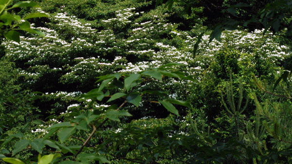 | 濃い緑の六甲の山のあちこちで真っ白な花が輝いています。この美しい白色の正体はヤマボウシの花です。ヤマボウシの木は枝を横にいっぱいに広げています。広げた枝いっぱいに真っ白な花を無数につけている。木全体が真っ白。見事に美しい光景である。秋に赤くなる実はすごくおいしい。花の美しい光景とおいしい実を与えてくれるヤマボウシの木は実に貴重な木である。クリックすると「ヤマボウシのページ」「プログのヤマボウシ」へ |